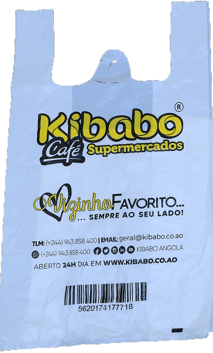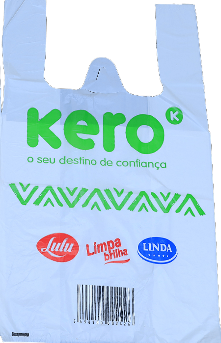Descrição: Sacolas plásticas de compras são utilizadas para armazenar e transportar produtos como alimentos, hortifrutigranjeiros, etc., em supermercados ou residências.